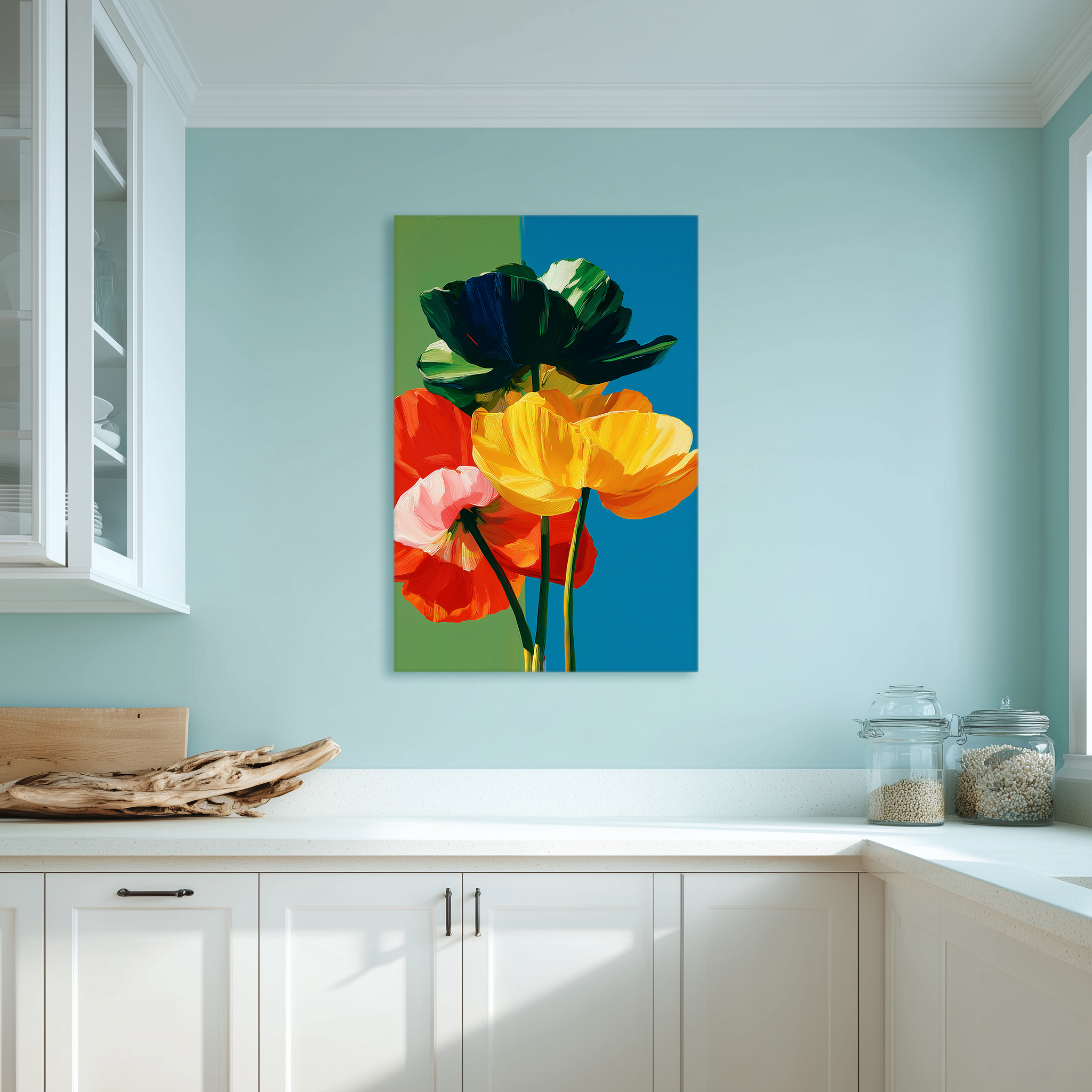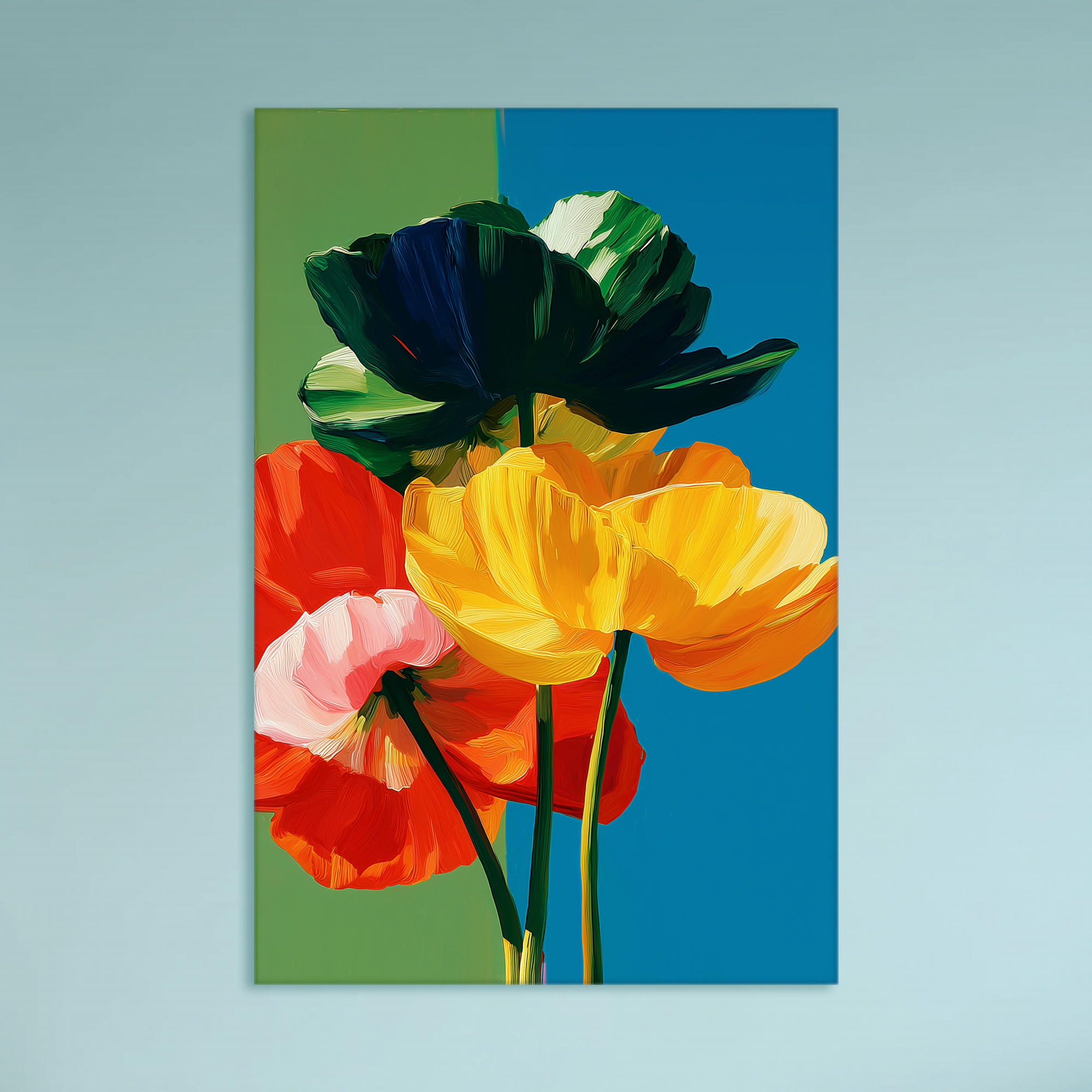 Un conjunto de flores se eleva con gesto orgánico sobre un fondo dividido en campos de color, donde el azul profundo y los verdes suaves dialogan con rojos y amarillos vibrantes. Esta escena, seleccionada por BLENZO studio, celebra la fuerza expresiva del color y la materia pictórica, transformando lo botánico en una composición contemporánea y viva. Los trazos visibles y la superposición cromática aportan una sensación de movimiento sereno, entre lo natural y lo abstracto.