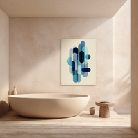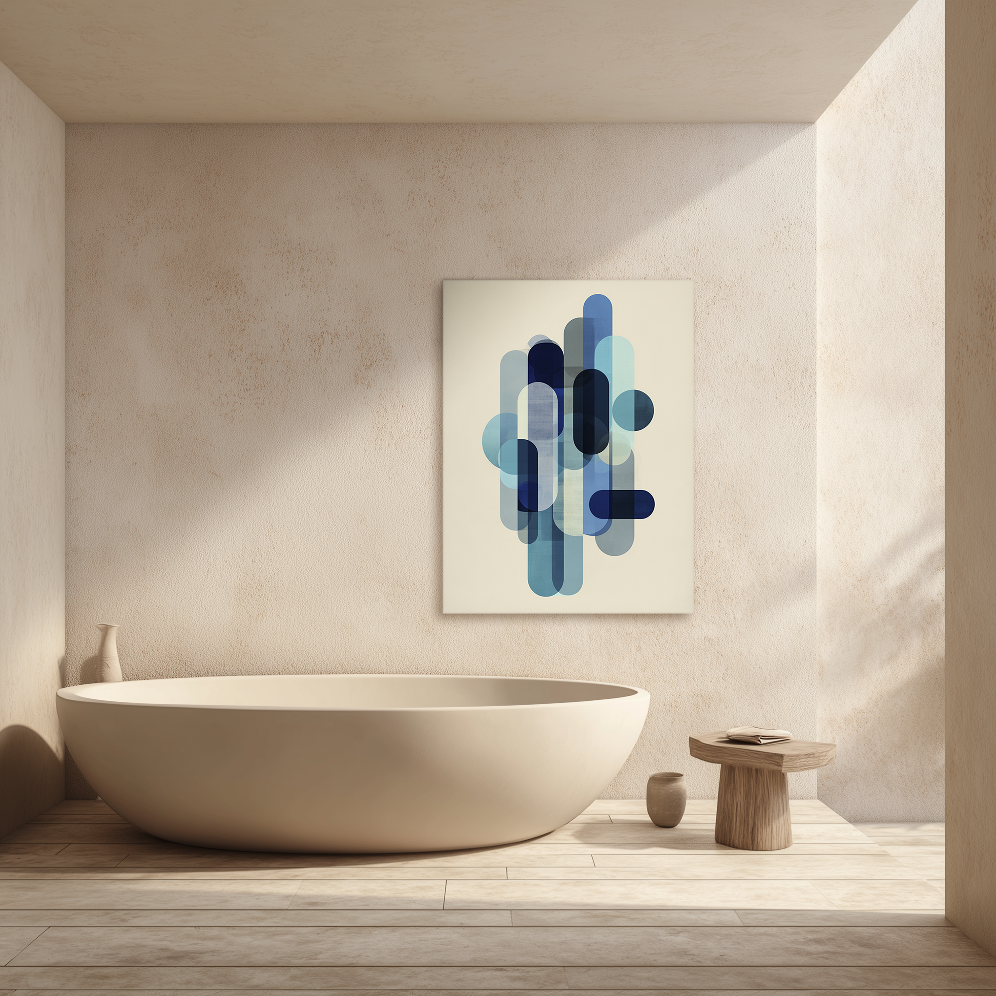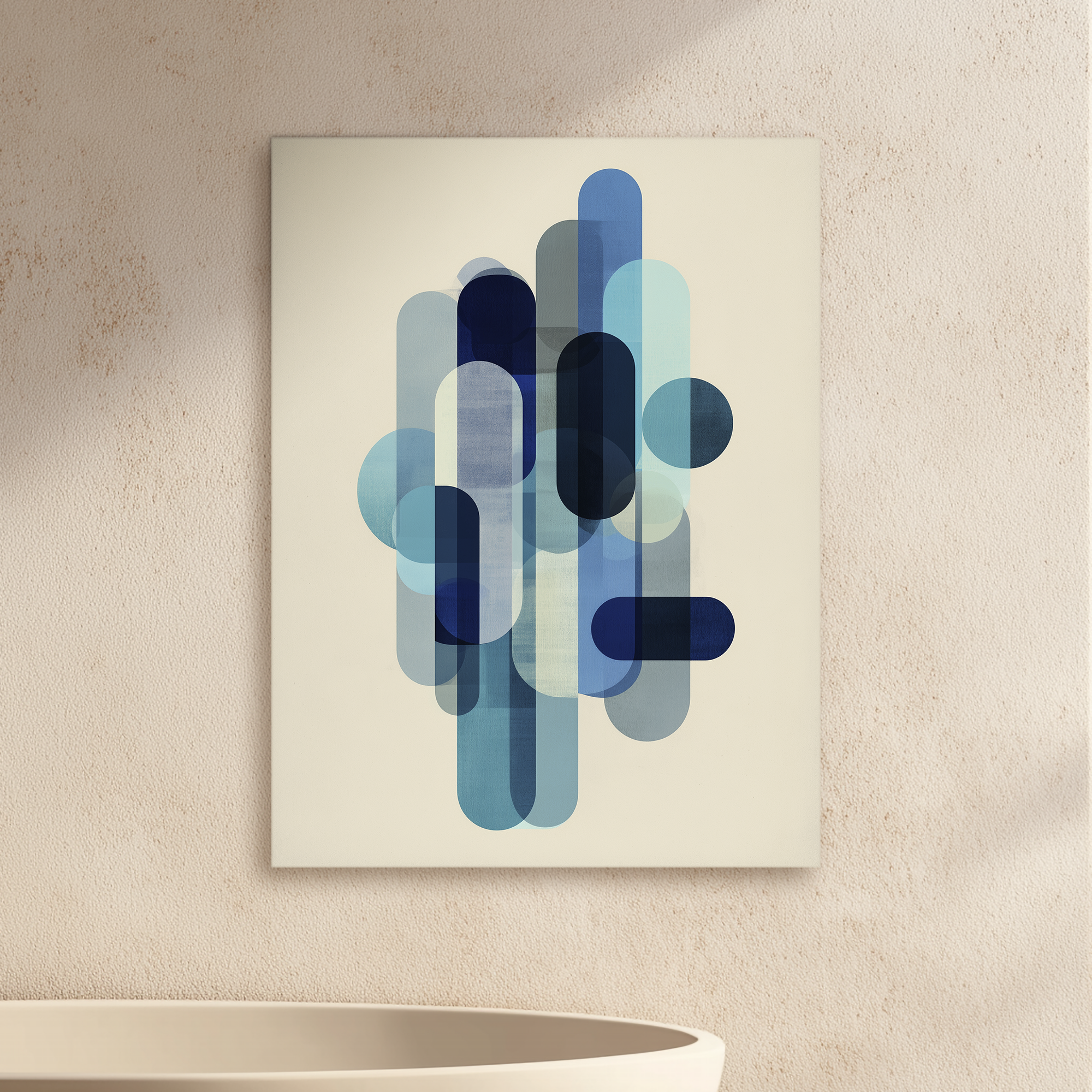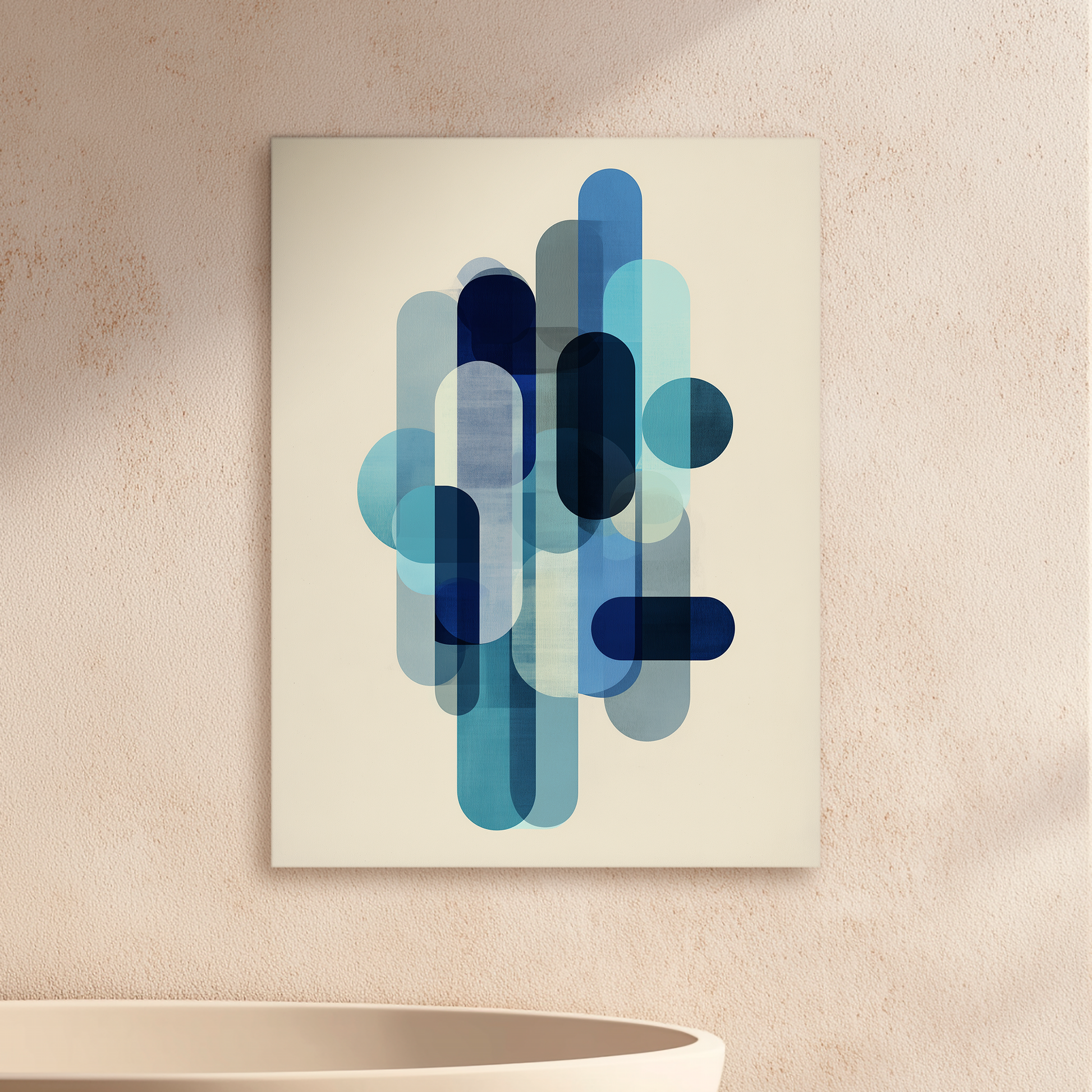 Formas geométricas superpuestas en distintos tonos de azul construyen una estructura vertical de serenidad digital. Esta creación de BLENZO studio combina precisión gráfica con sutileza cromática, generando una composición tan limpia como evocadora.