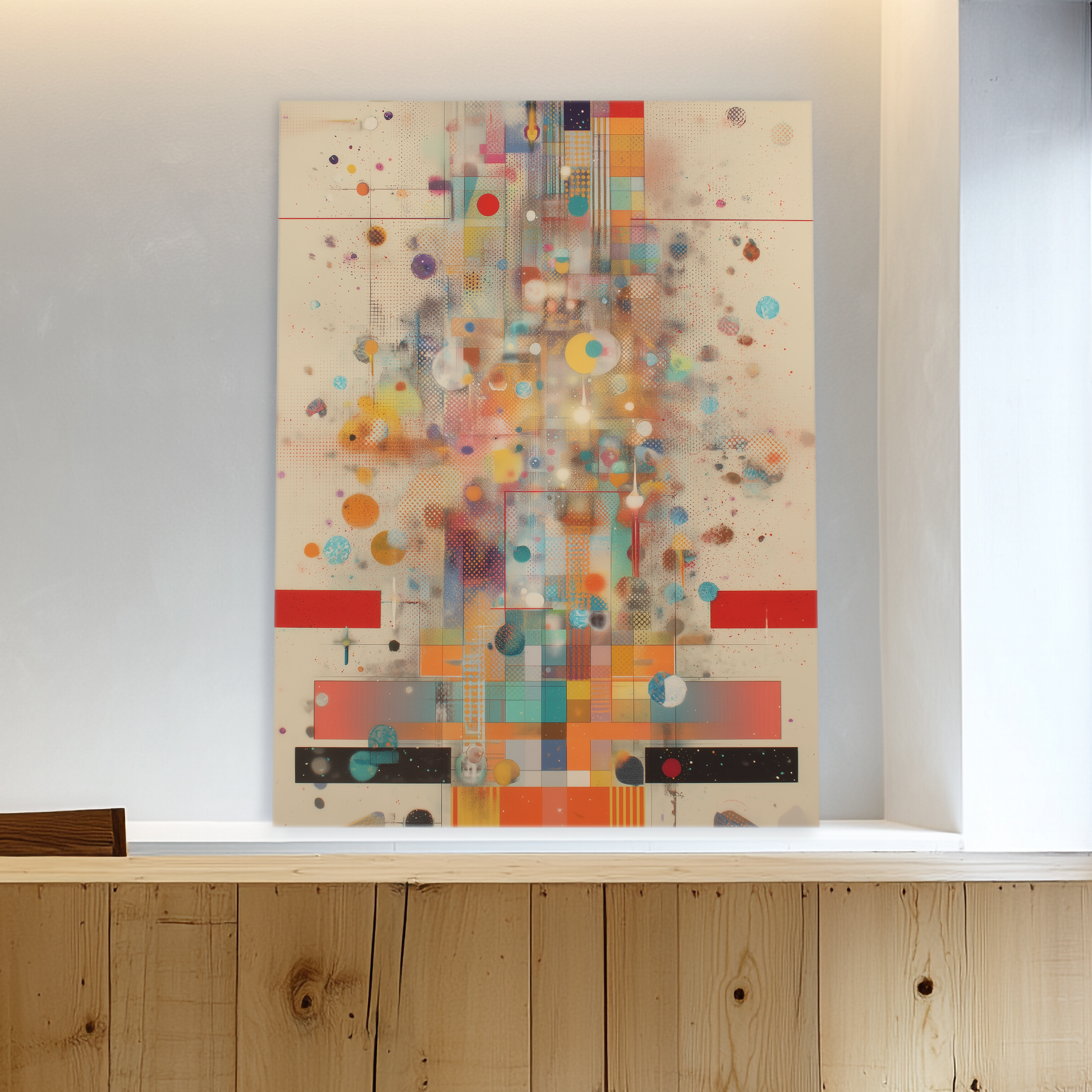 Esta composición vertical une geometría digital y caos cósmico en una explosión de color y energía. El estilo neo-psicodélico se manifiesta en formas circulares, píxeles difuminados y texturas espaciales cuidadosamente seleccionadas por BLENZO studio.