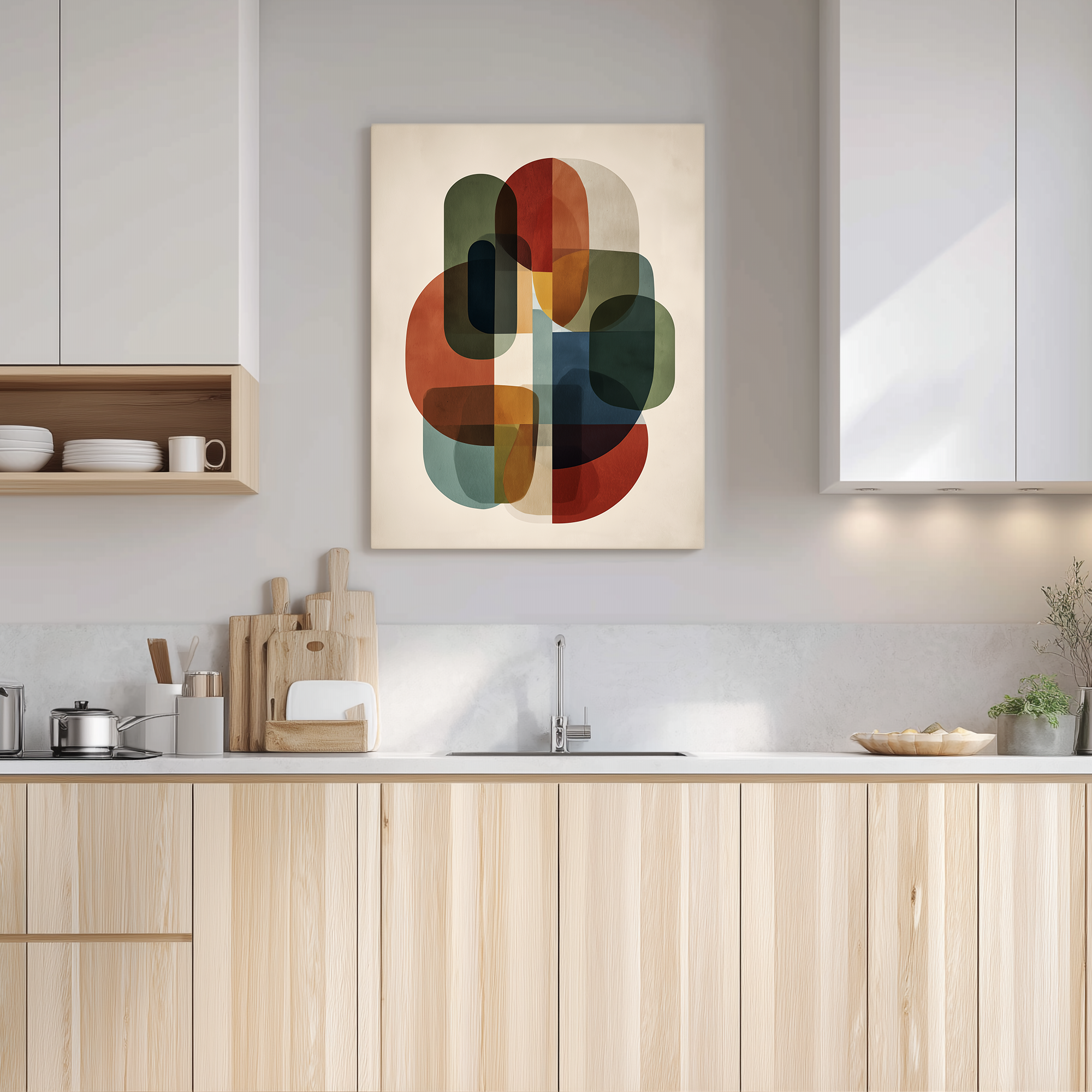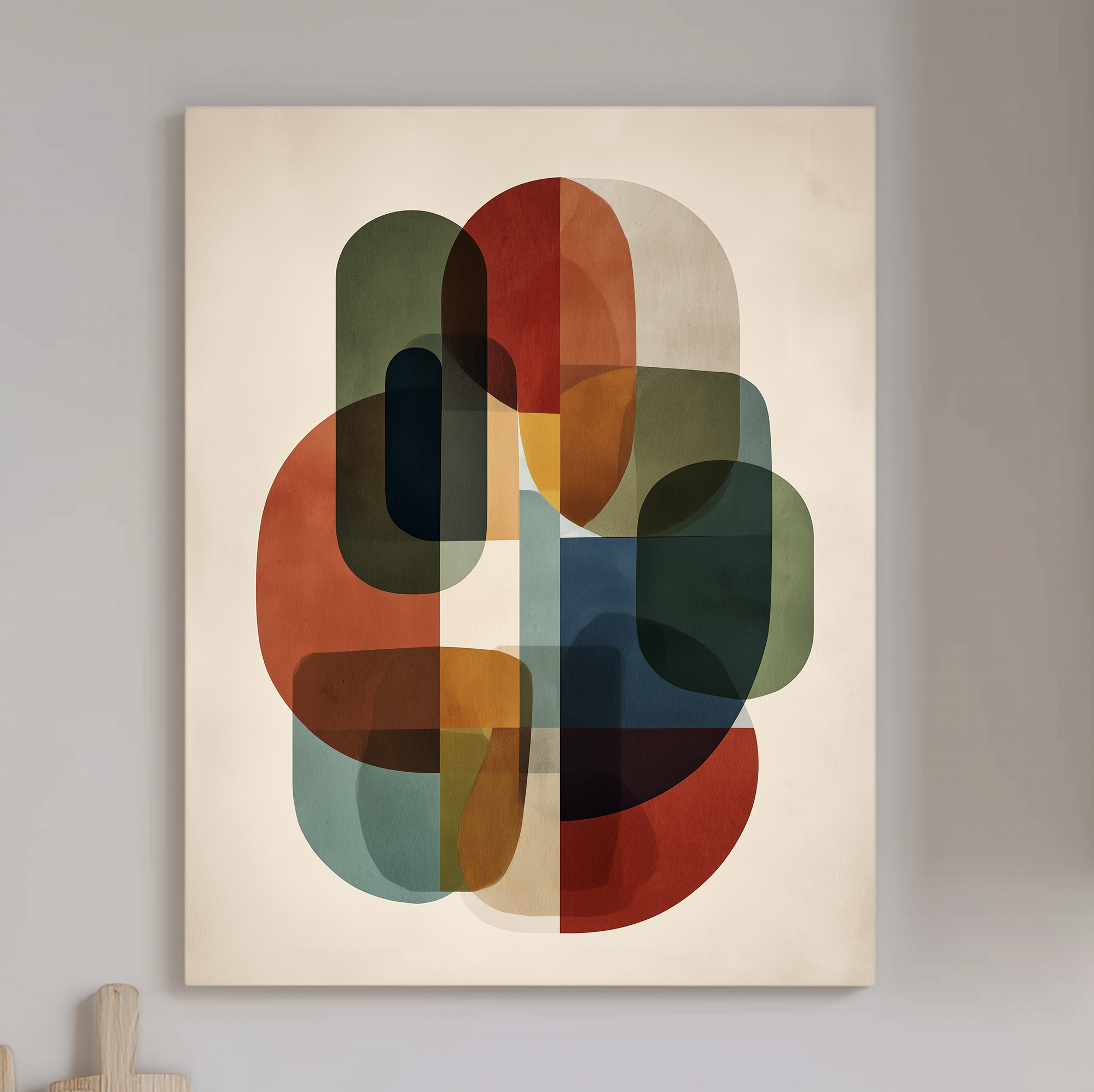 Formas geométricas superpuestas con transparencias y una paleta sobria evocan el legado de la escuela Bauhaus. Una composición abstracta equilibrada y atemporal, cuidadosamente seleccionada por BLENZO studio.