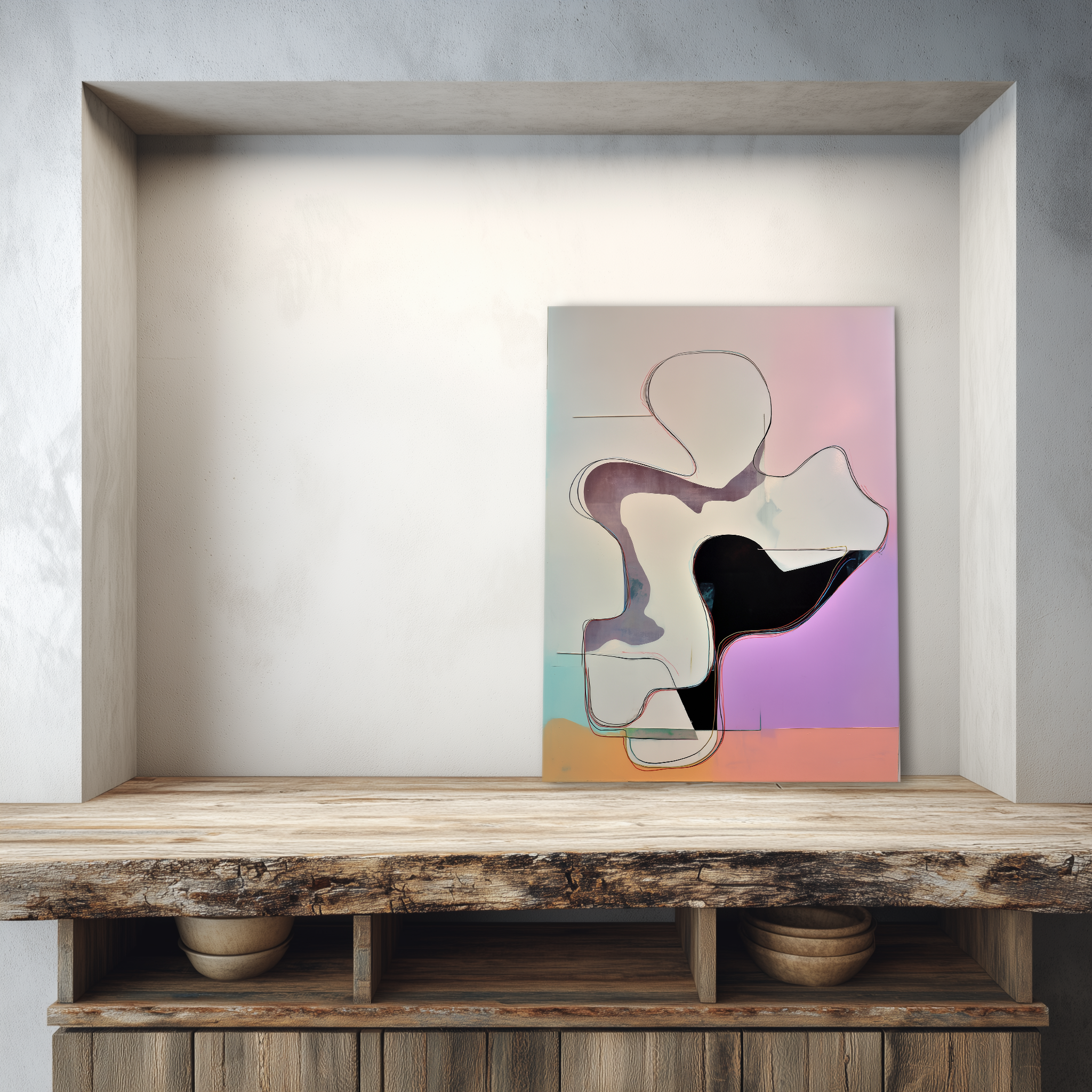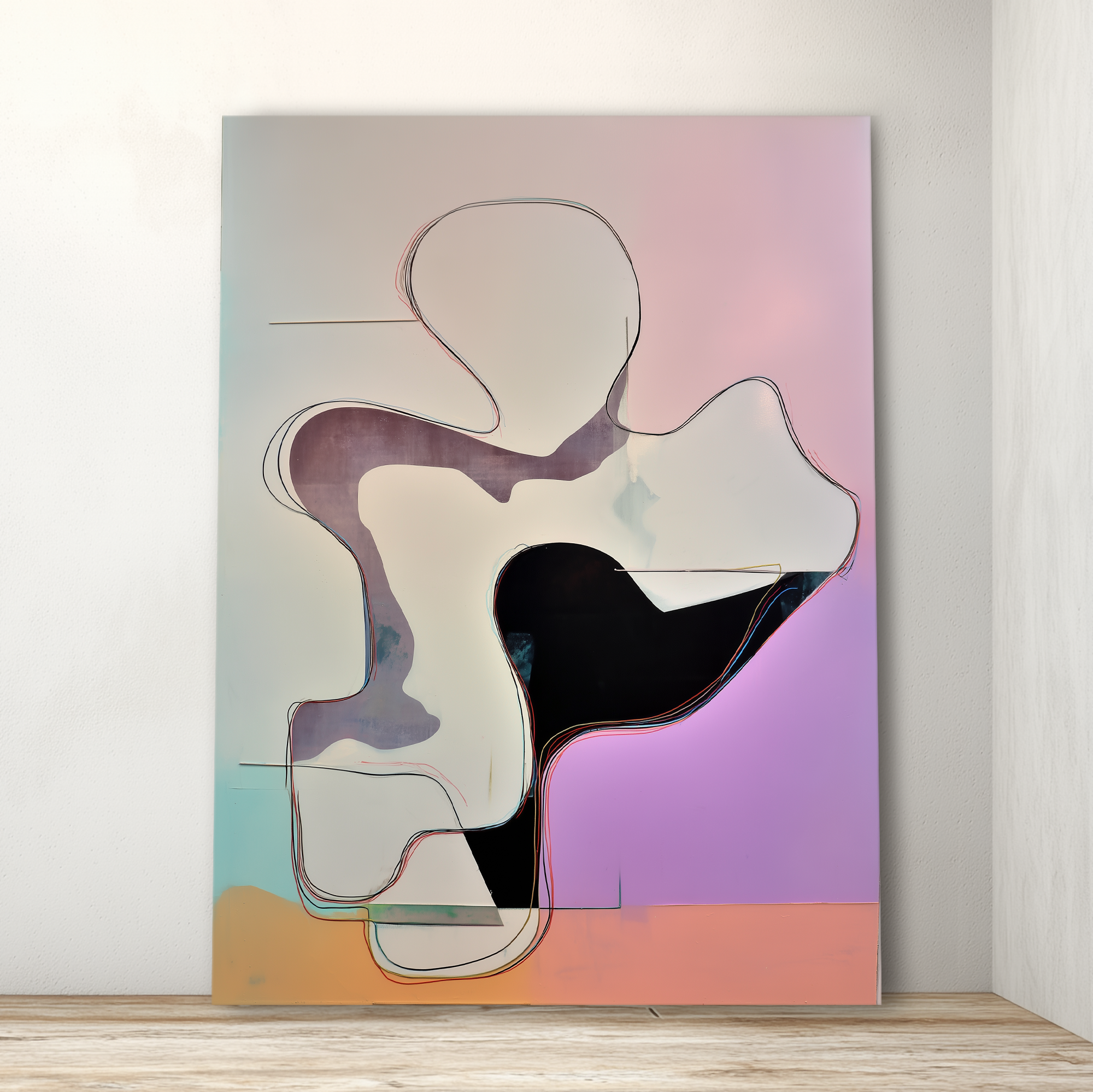 Una figura orgánica se despliega en el centro de una superficie suave, envuelta en contornos lineales que delimitan su forma sin atraparla. El fondo, de tonos pastel y texturas sutiles, genera una sensación de fluir pausado. Una propuesta visual sugerente y etérea de la colección de BLENZO studio.
