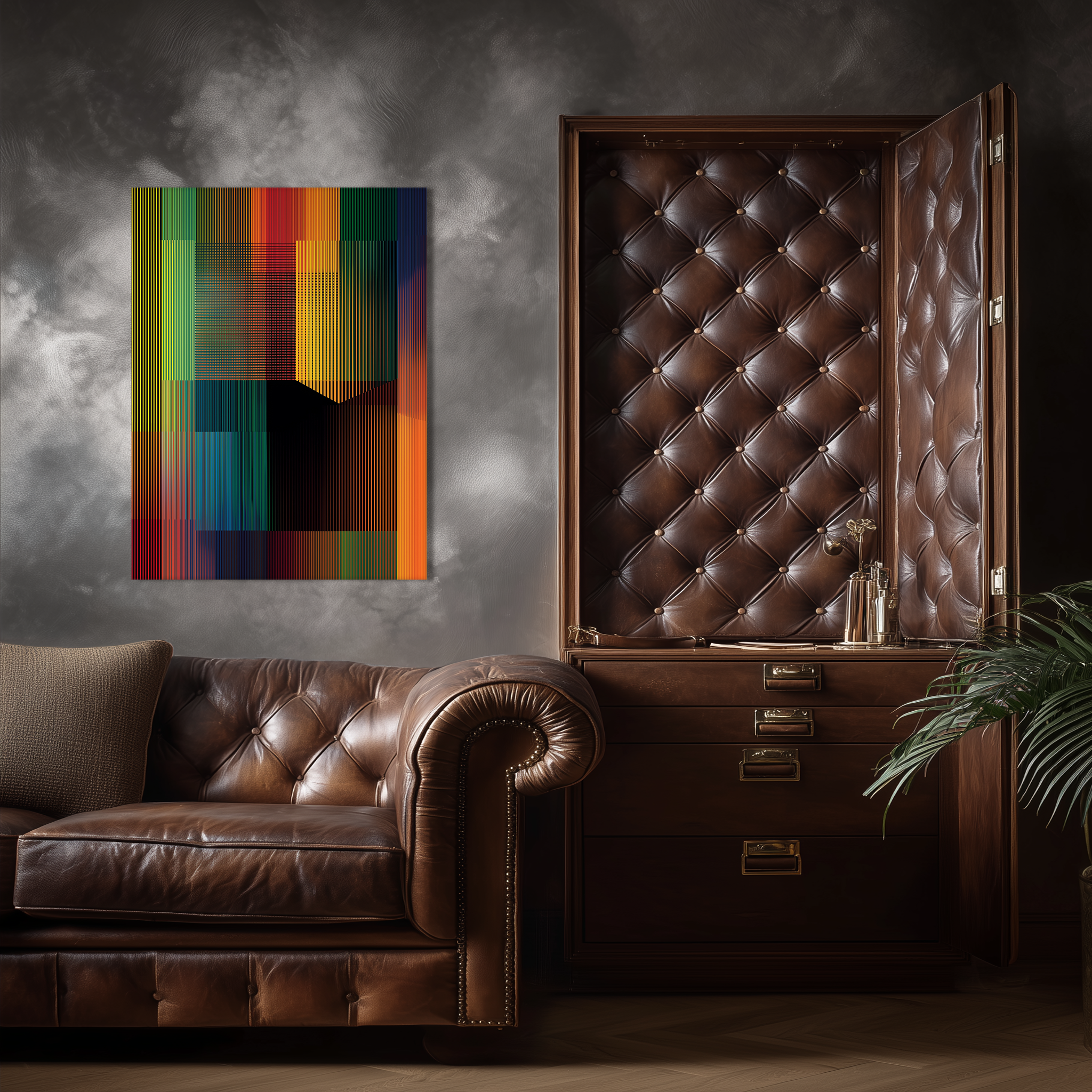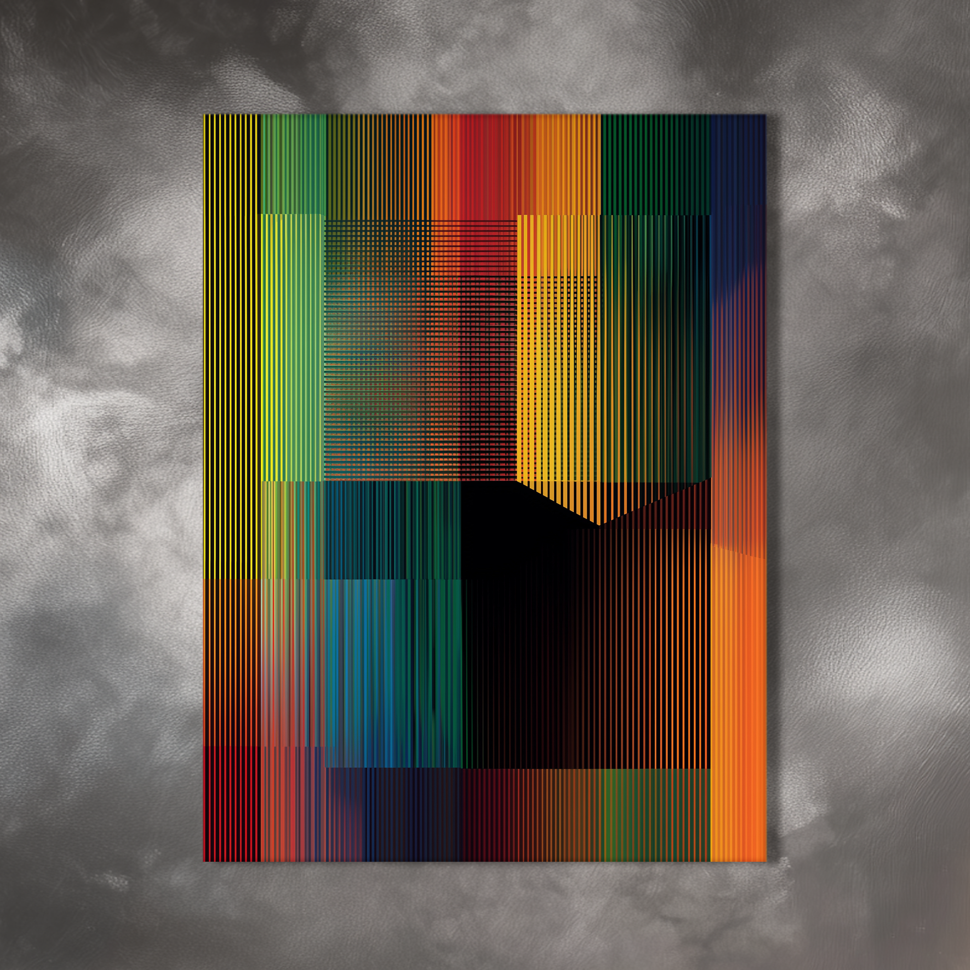 Un juego visual de líneas verticales que se entrecruzan en capas, generando vibración óptica y sensación de movimiento. La intensidad cromática y la estructura rítmica configuran una pieza que pone a prueba la percepción, en sintonía con el enfoque experimental de BLENZO studio.