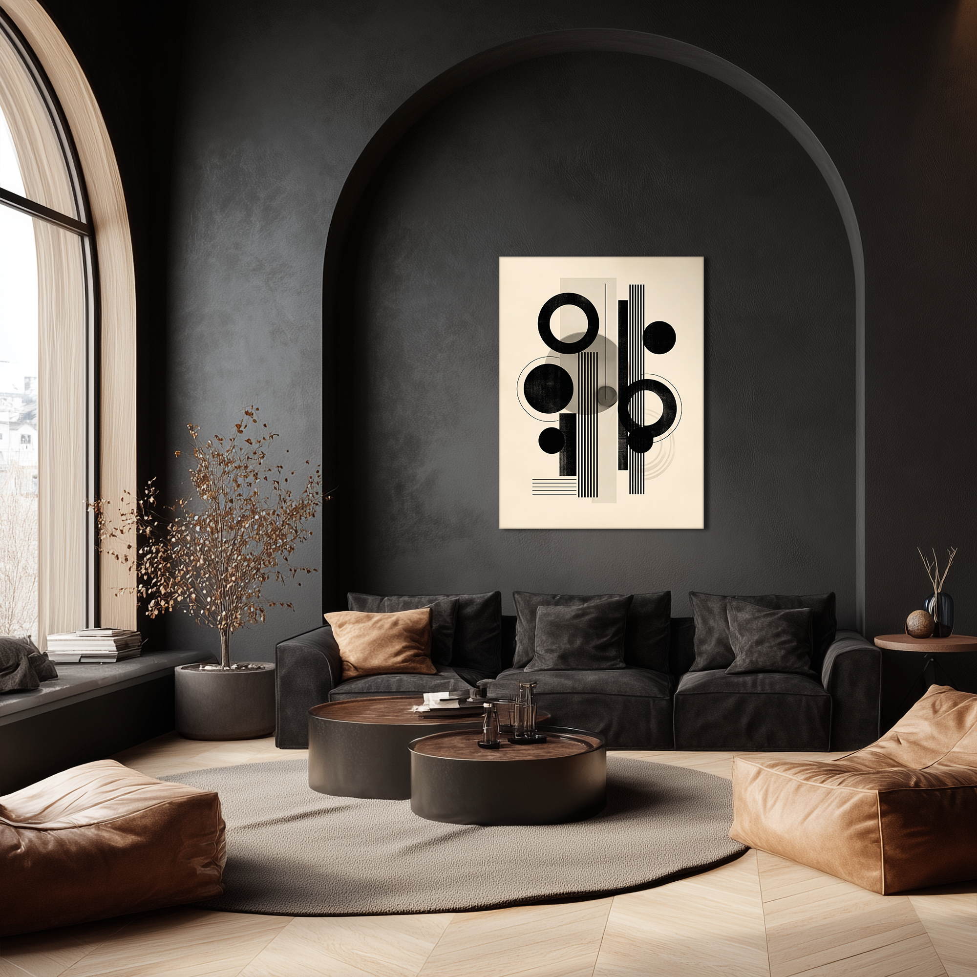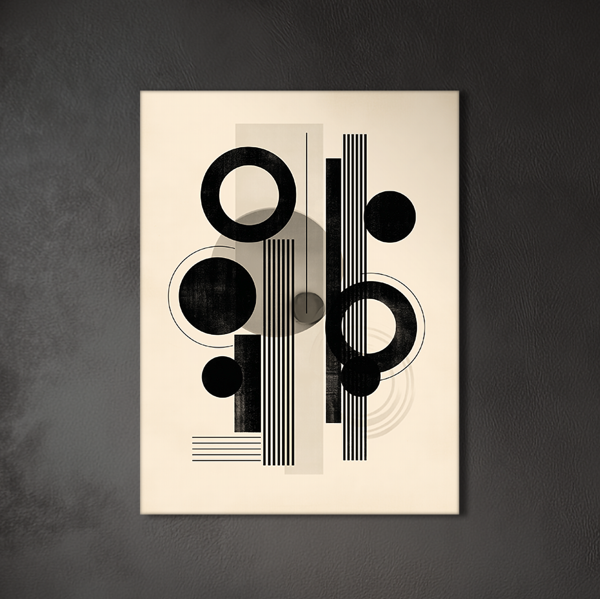 Una composición gráfica y equilibrada que articula formas geométricas puras sobre fondo neutro, con una disposición rítmica de líneas y círculos en negro. El contraste entre lo lleno y lo vacío crea una tensión visual magnética que define esta pieza con carácter. Una creación con el sello editorial de BLENZO studio.