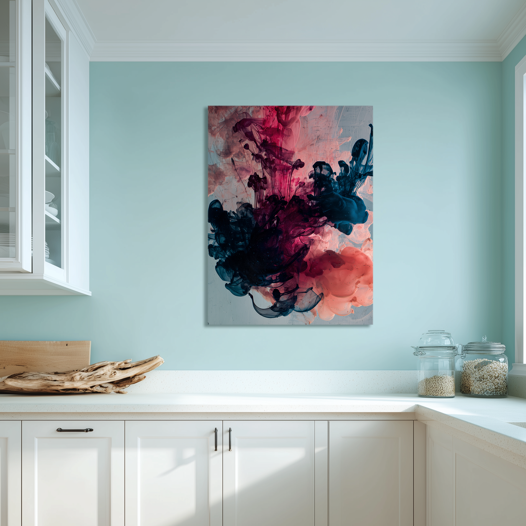 Una danza líquida de pigmentos oscuros y rojizos se despliega sobre un fondo celeste, generando una atmósfera envolvente e hipnótica. Las texturas y veladuras recuerdan corrientes en suspensión, componiendo una obra intensa y profundamente sensorial. Curada por BLENZO studio, esta pieza captura el instante en que el color se convierte en emoción visual.