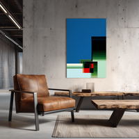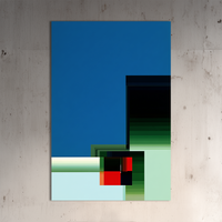 Una composición geométrica radical y minimalista donde los bloques de color se ordenan en un sistema visual de fuerzas y silencios. Predominan el azul profundo y los verdes modulados, con un acento rojo vibrante que actúa como ancla de tensión. Curada por BLENZO studio, esta obra remite a la tradición del modernismo abstracto.