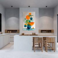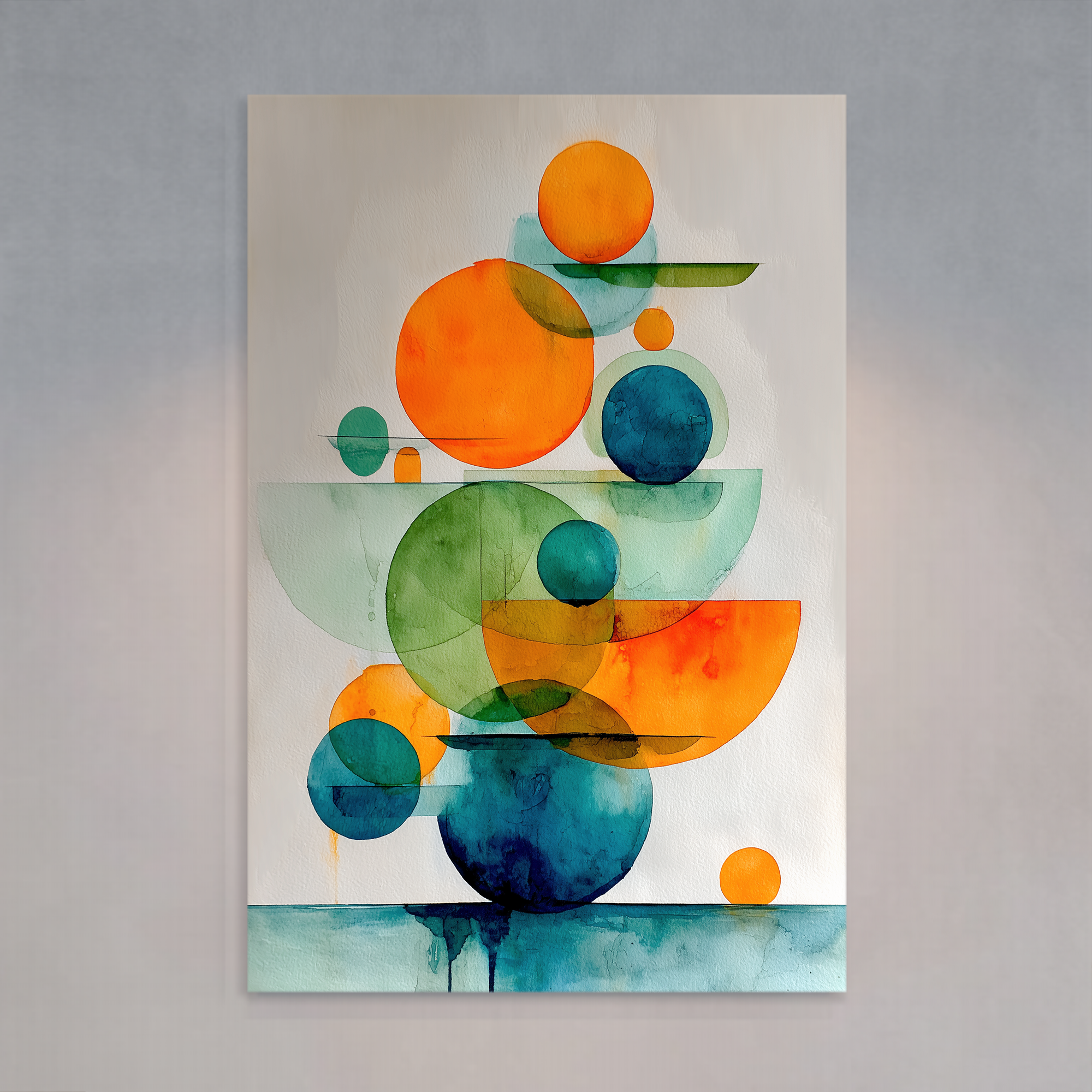 Descripción (ES) Una composición equilibrada donde círculos translúcidos en tonos naranjas, verdes y azules se intersectan con gracia sobre un fondo neutro. El uso del color y la superposición genera profundidad y ritmo visual, evocando una geometría lúdica y meditativa. Curada por BLENZO studio, esta obra invita a contemplar el equilibrio entre forma y emoción.