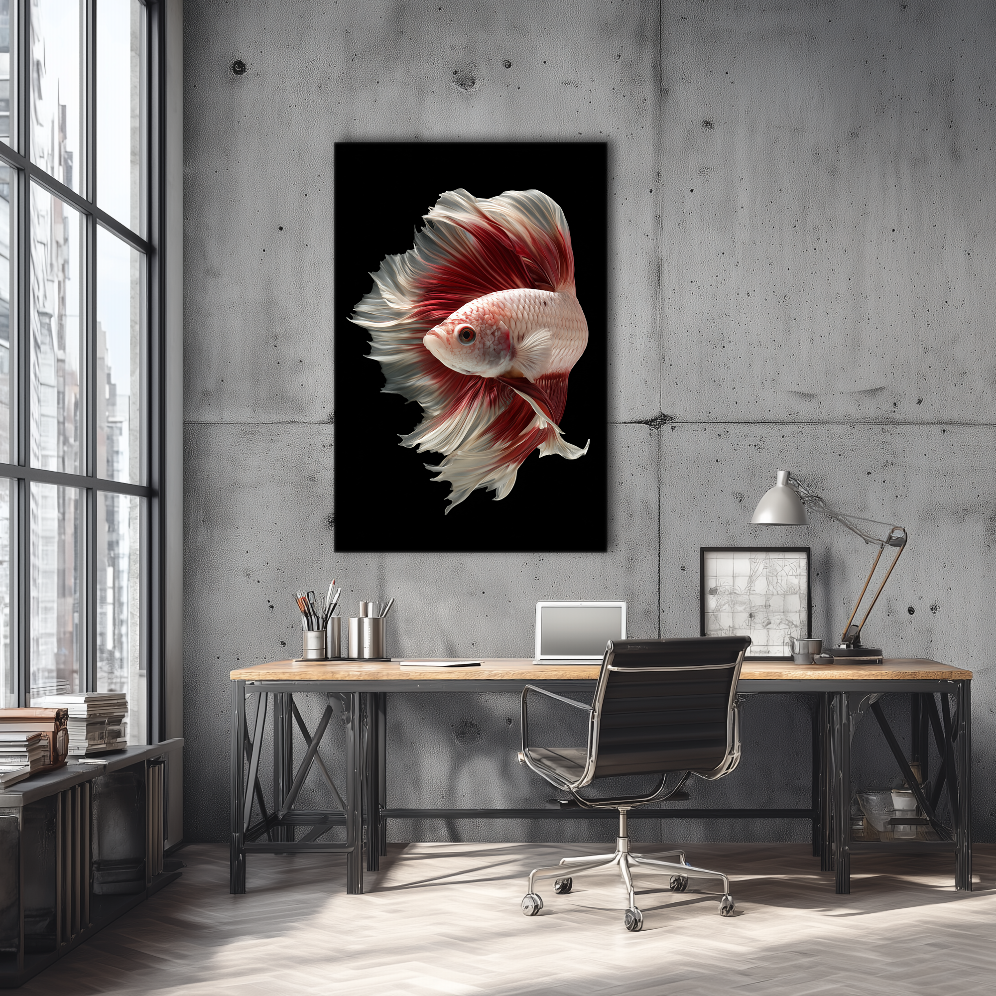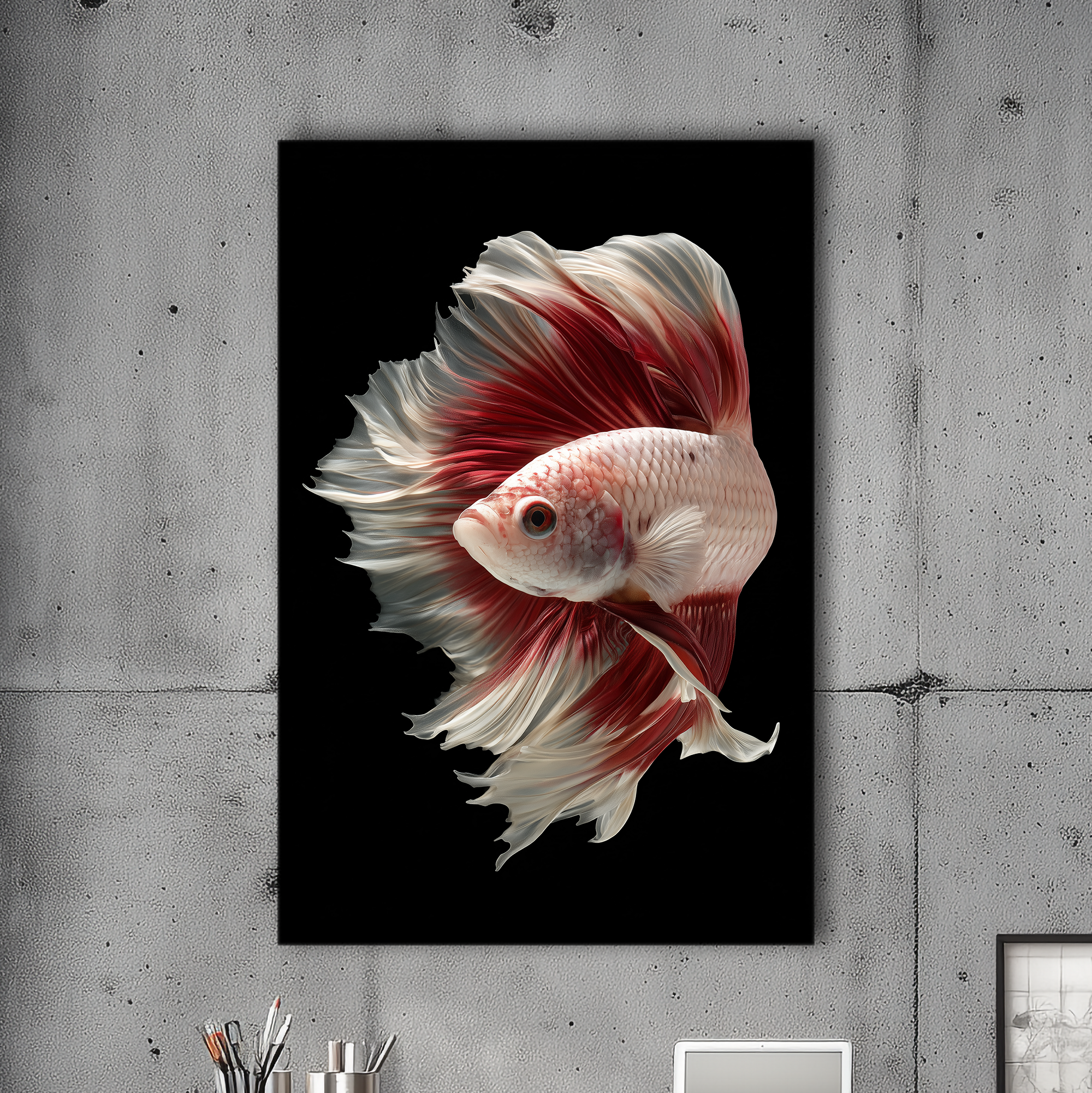 Un pez betta emerge desde la oscuridad con una presencia hipnótica y solemne. Cada aleta parece flotar en suspensión dramática, resaltando su belleza simbólica y su elegancia natural. Una escena de tensión delicada, minimalista y magnética. Una creación de BLENZO studio.