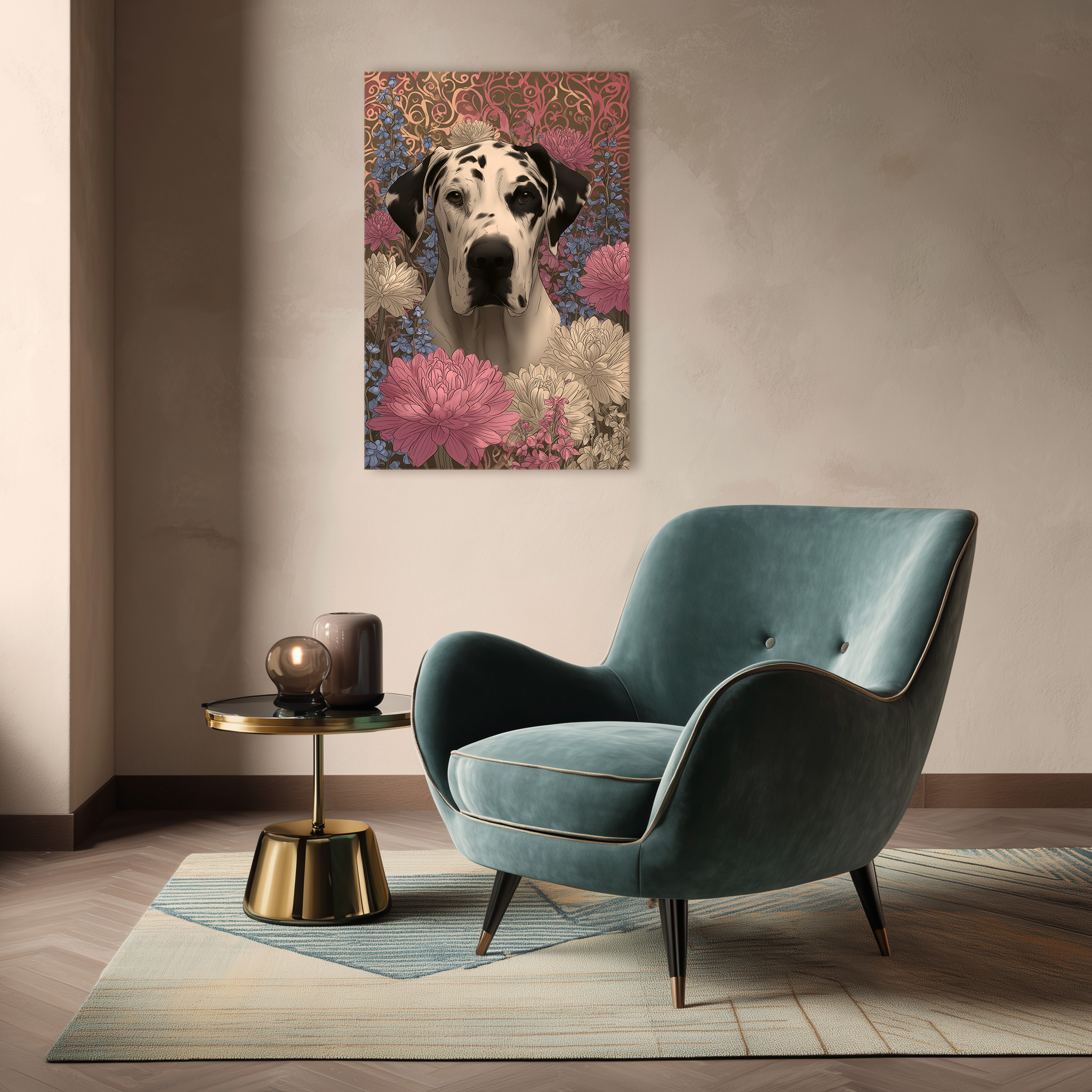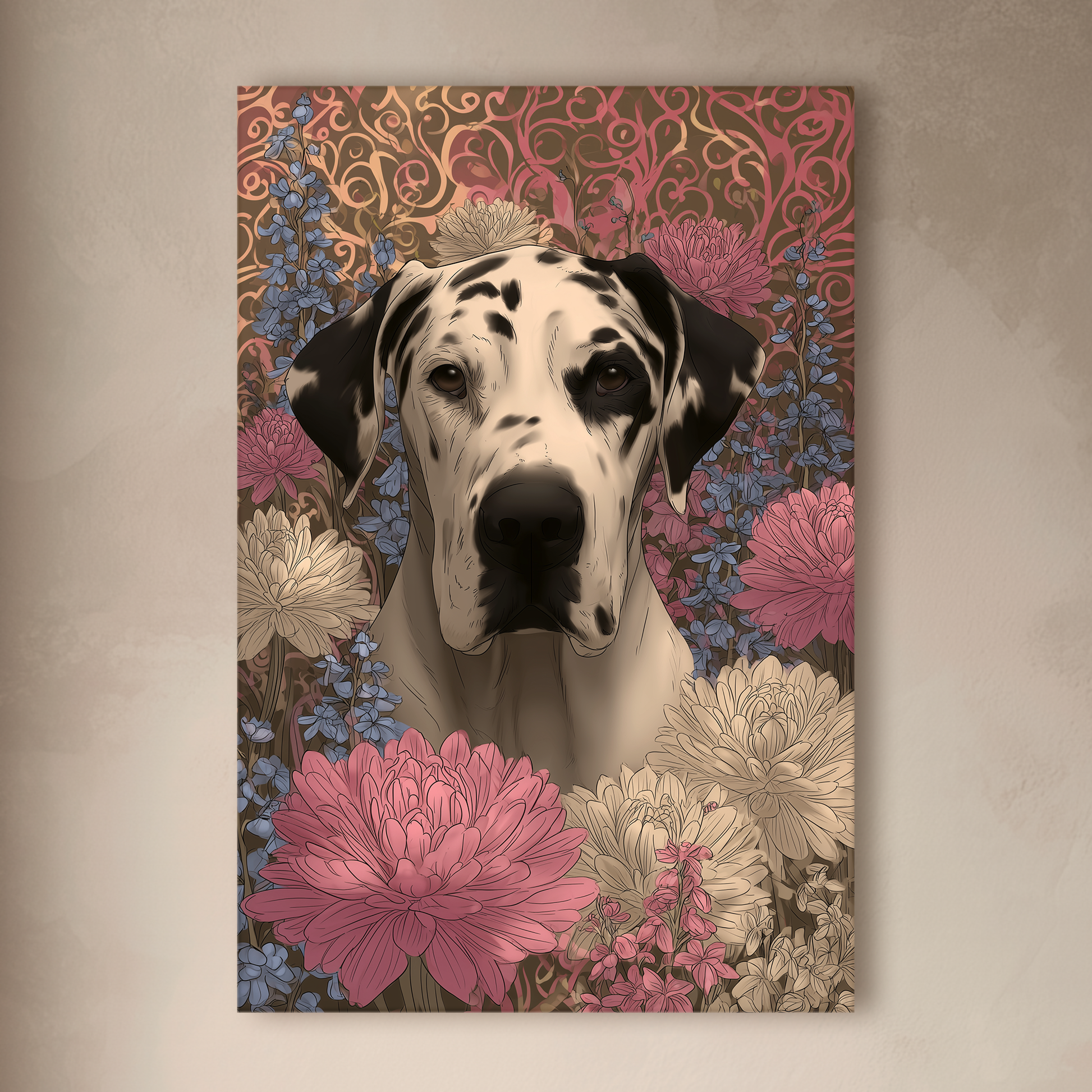 En esta ilustración digital protagonizada por un gran danés, los trazos suaves y el entorno floral aportan un aire nostálgico y ornamental. La paleta cálida en rosas, cremas y lilas, junto con el patrón de fondo en tonos dorados, genera una atmósfera entre decorativa y simbólica. Seleccionada por BLENZO studio por su fusión entre fuerza y fragilidad visual.