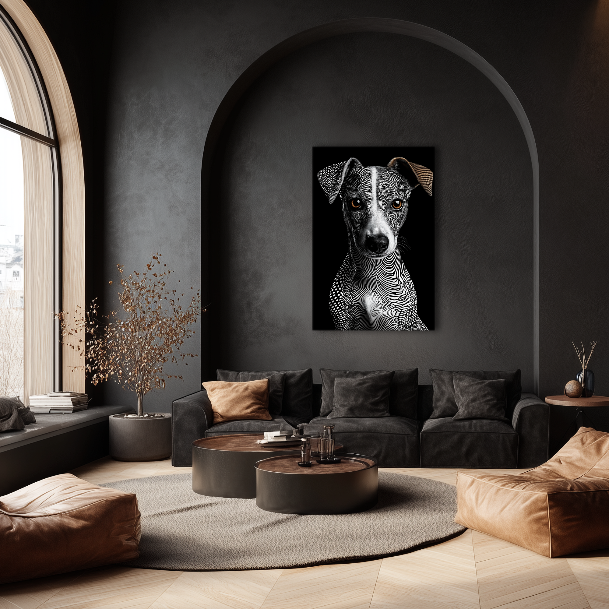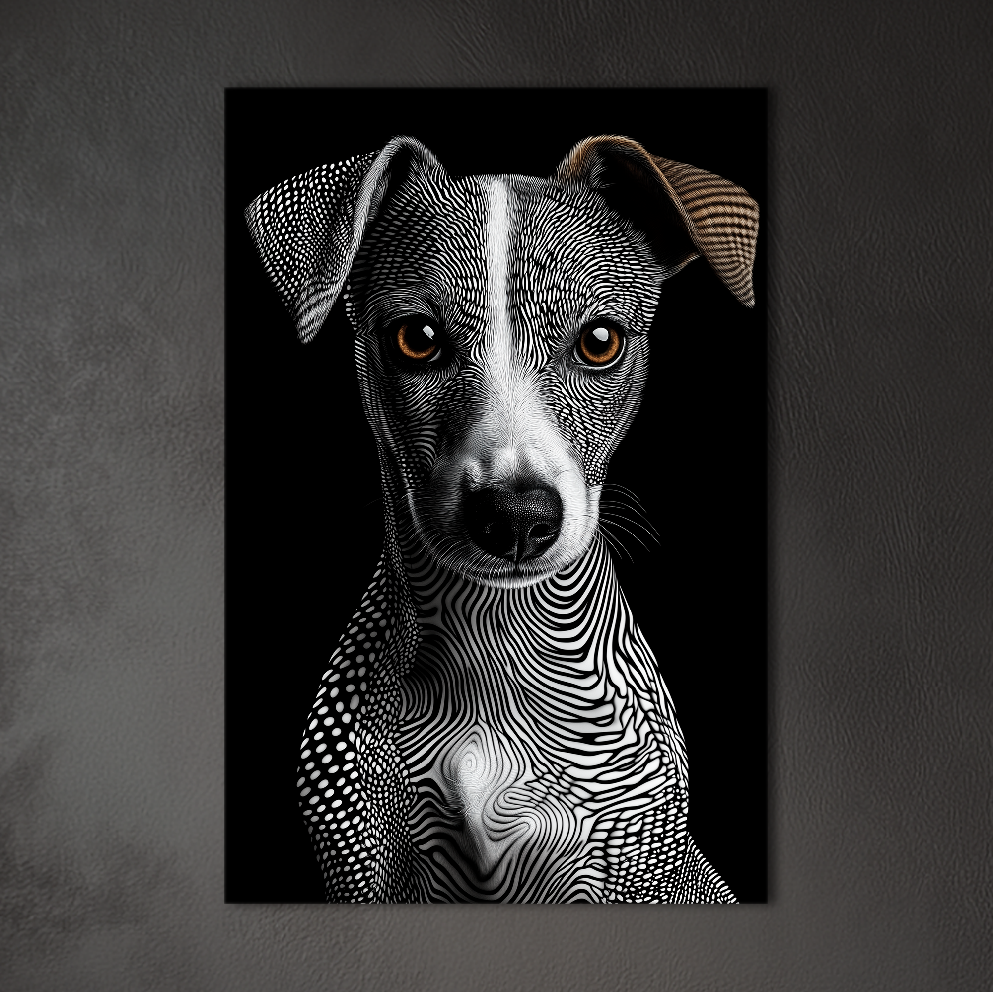 Un retrato gráfico de un Jack Russell Terrier, donde las líneas hipnóticas en blanco y negro transforman su silueta en un patrón visual envolvente. Una pieza seleccionada por BLENZO studio, que fusiona lo animal y lo geométrico en un lenguaje contemporáneo atrevido.