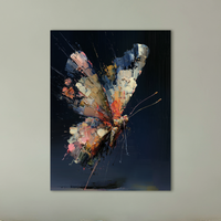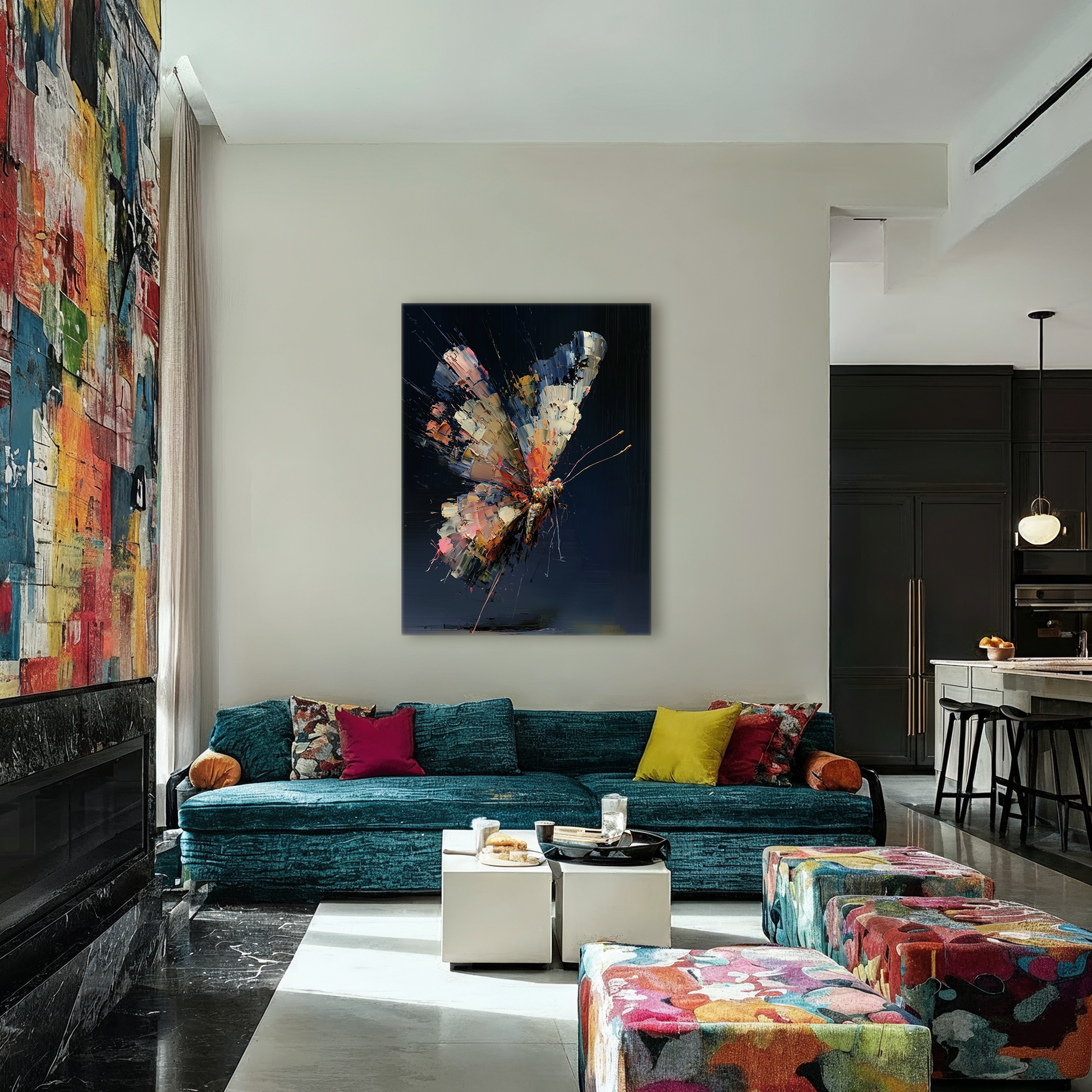 Una mariposa fragmentada en trazos pictóricos evoca la fusión entre lo natural y lo abstracto. La obra explora el movimiento suspendido a través de texturas impetuosas y colores vibrantes que dan vida a una criatura etérea en pleno vuelo. Curada por BLENZO studio, esta pieza transmite energía, libertad y delicadeza visual.