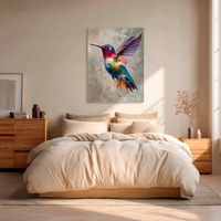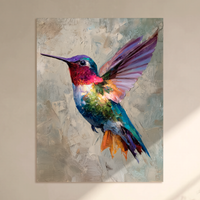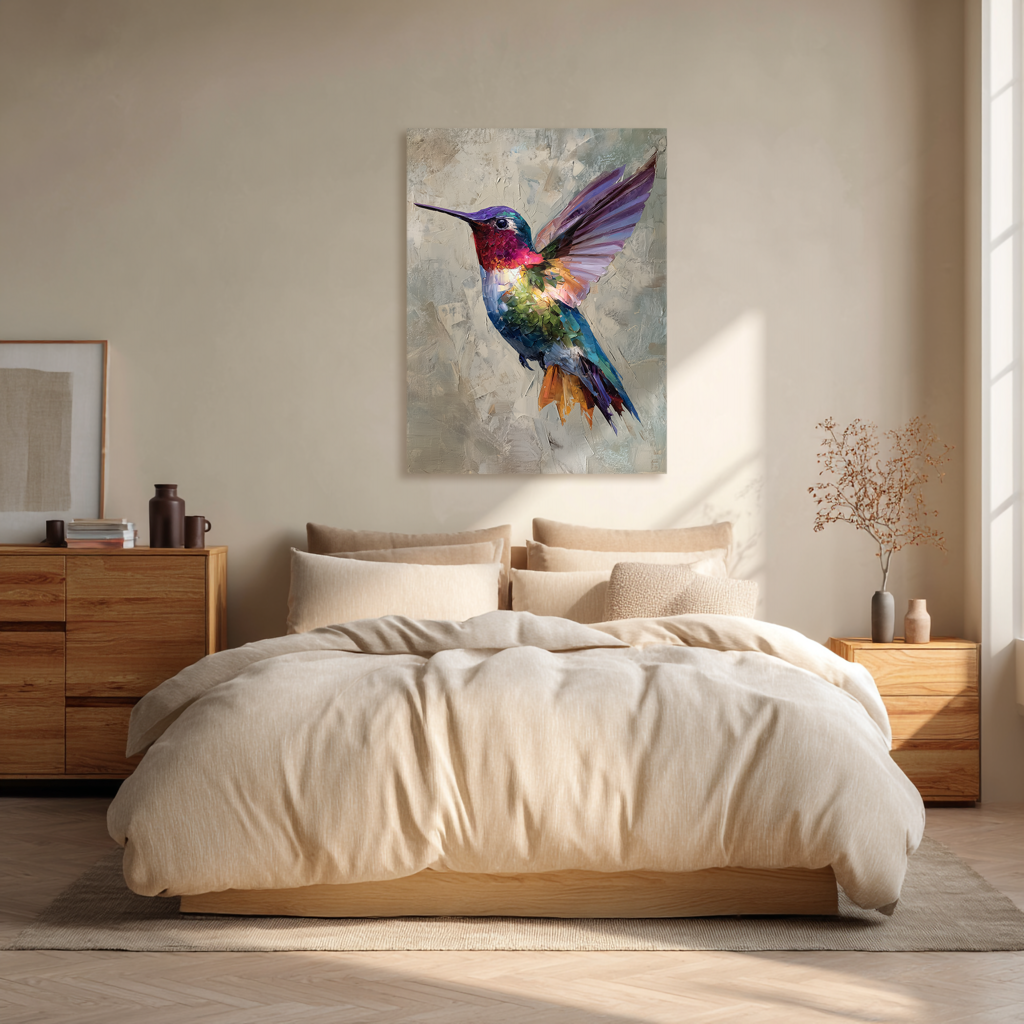 Un colibrí en pleno vuelo, construido con pinceladas impetuosas y una paleta vibrante, se convierte en emblema de energía contenida y belleza suspendida. La textura densa y cromática crea una sensación táctil que trasciende lo figurativo. Seleccionada por BLENZO studio, esta obra encarna la fugacidad con una potencia visual magnética.