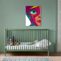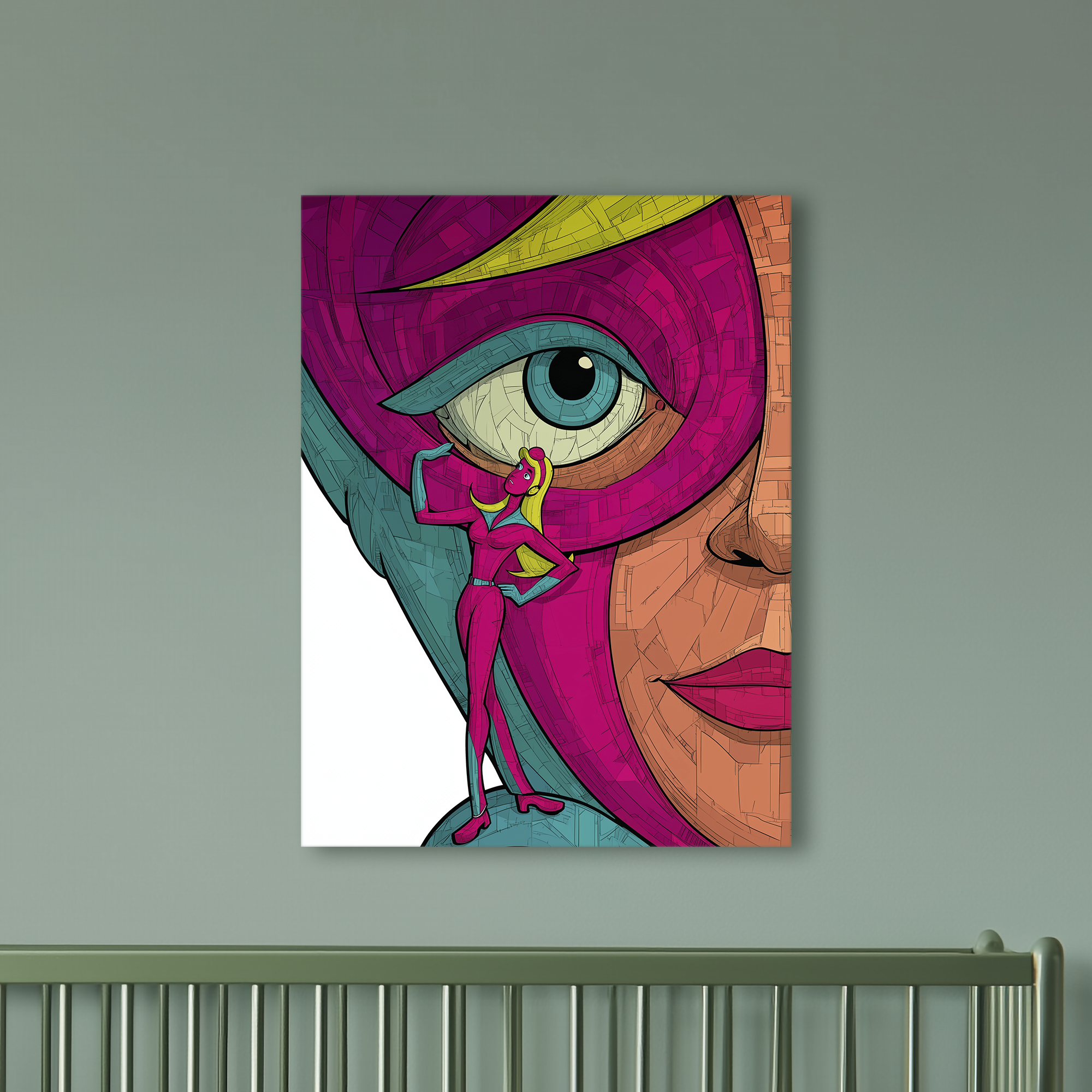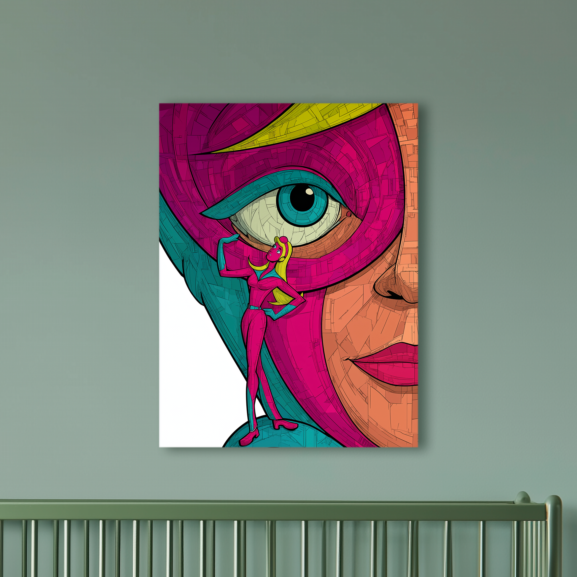 Una escena pop estilizada que remite a la estética de los dibujos animados de los años 80, donde una figura femenina rubia se sitúa frente a un ojo ampliado. Esta ilustración, de colores saturados y espíritu nostálgico, ha sido seleccionada por BLENZO studio por su potencia gráfica y su carácter evocador.
