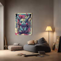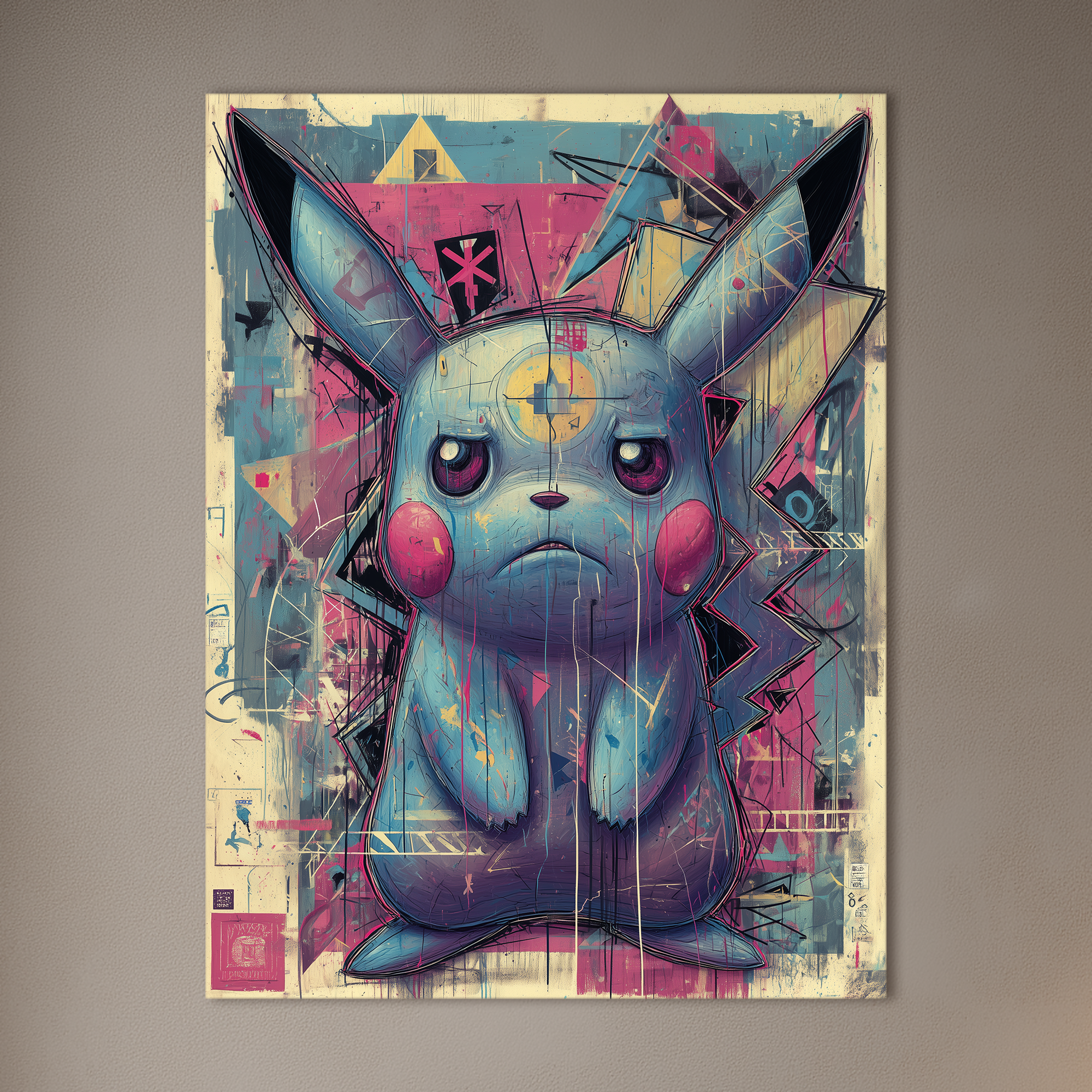 Criatura fantástica reinterpretada en clave urbana con trazos expresivos, geometrías caóticas y una paleta de colores saturados. Esta composición desafiante equilibra lo lúdico con lo crítico, en una estética que recuerda al arte callejero y al grafismo digital. Curada por BLENZO studio, la obra encarna una mirada rebelde y vibrante del imaginario pop.