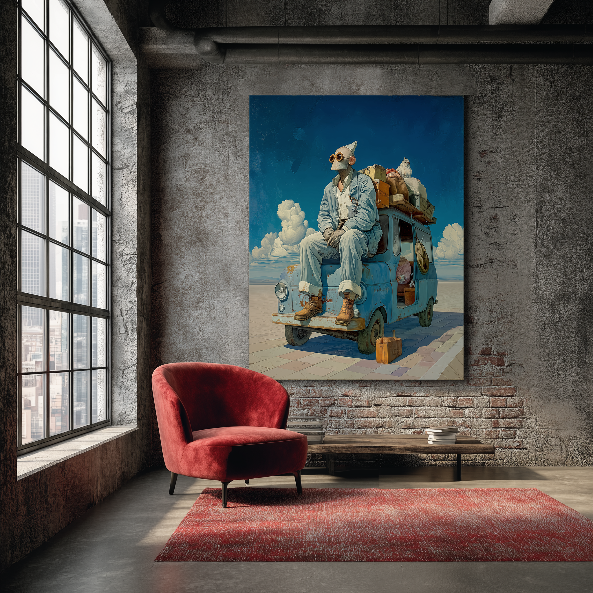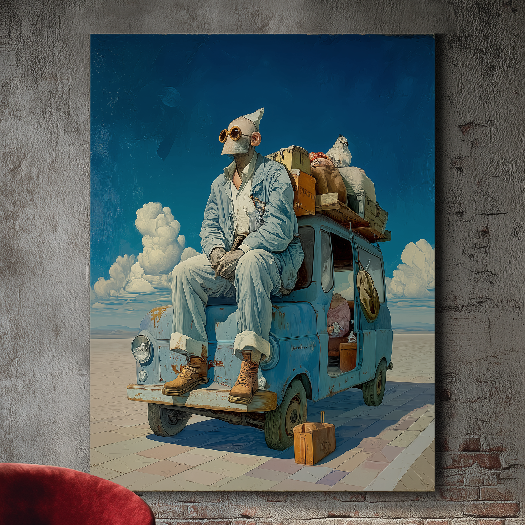 Un personaje enigmático, sentado sobre una furgoneta cargada de equipaje, observa el horizonte bajo un cielo azul intenso. Seleccionada por BLENZO studio, esta imagen surrealista evoca el silencio del viaje interior y el absurdo melancólico de los destinos inciertos.