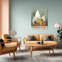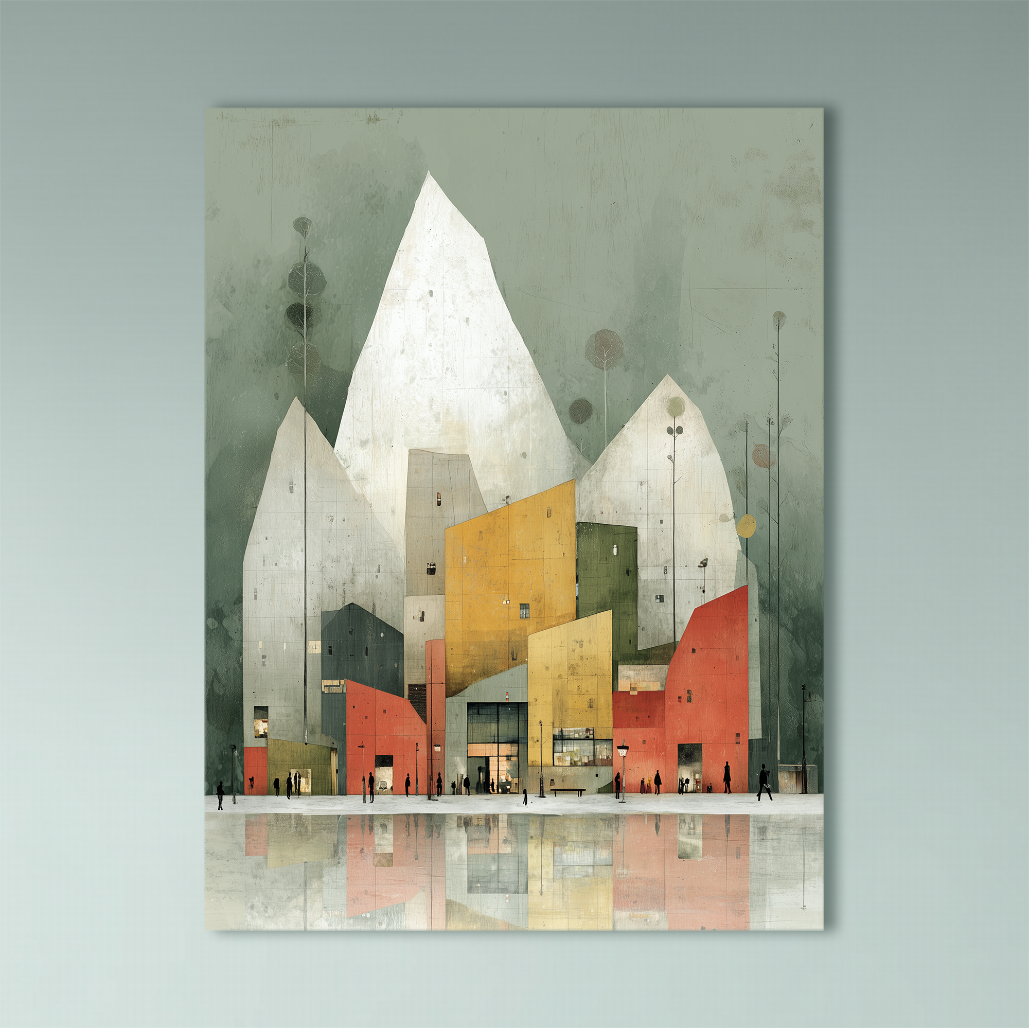 Una arquitectura de volúmenes coloridos se despliega sobre un fondo montañoso abstracto, como una aldea moderna que dialoga con la naturaleza. BLENZO studio presenta una obra que combina estructura, paisaje y escala humana con una sensibilidad gráfica contemporánea.