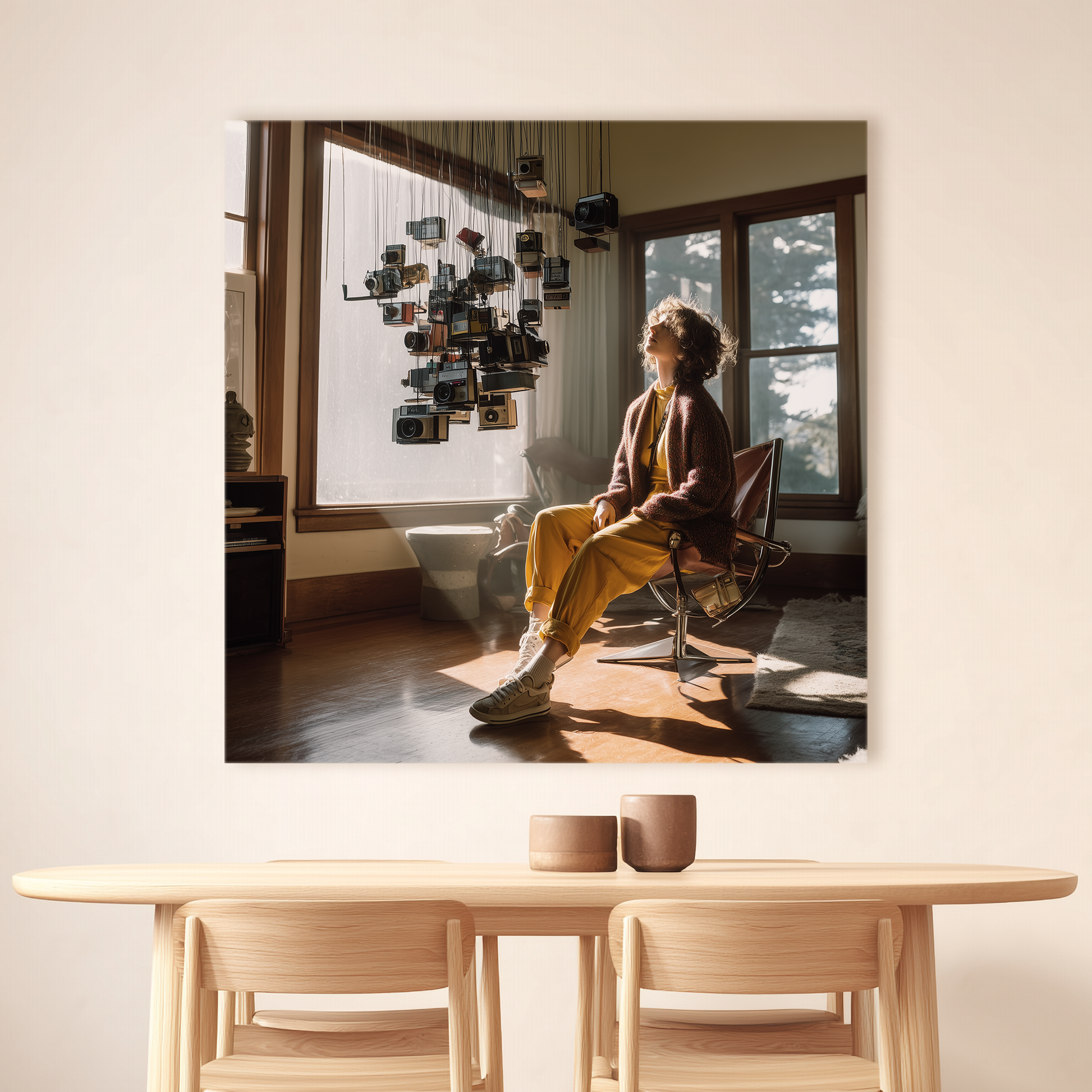 Une installation domestique où flotte la nostalgie. Des appareils photo vintage suspendus