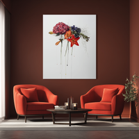 Una composición floral suspendida en el vacío. Hortensias, lirios y astrantias se agrupan como en un ramo ingrávido, con tallos que gotean suavemente sobre el fondo blanco. La imagen captura el instante en que lo natural se vuelve instalación, lo botánico se vuelve gesto. Un estudio del color y la suspensión creado por BLENZO studio.